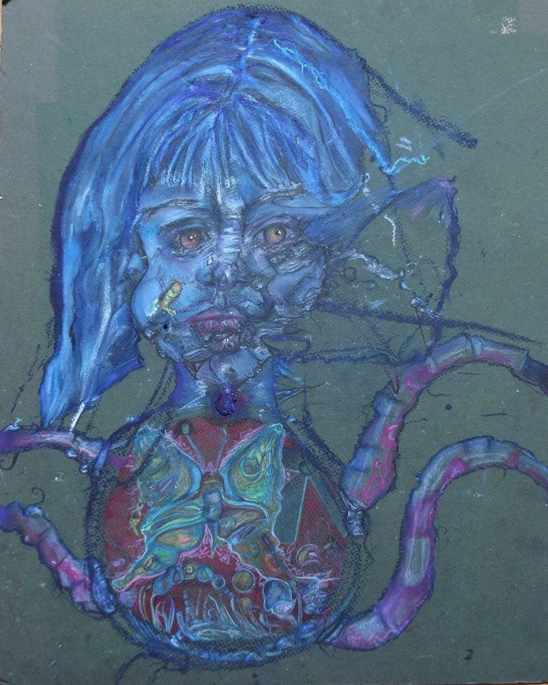 The first way to recognize a Contaminator piece is the intense color palette. The strong hues are due to using high-pigmented professional art materials. She uses the highest quality oil pastels and the best fixative on the market to bring forth intense and vivid imagery to her viewers. From Liquitex gesso, Montana Primer, acid-free papers, Sennelier fixative, Sennelier, and Holbein oil pastels, Kama Pigments, Windsor & Newton Oil Bar, Fiber Castell colored pencils (for detail), and Sennelier fixative. Each medium is carefully thought of to provide a raw, but archival finish. Her work often contains raw rips and punctures, but the quality of supplies is always geared towards archival longevity unless stated.